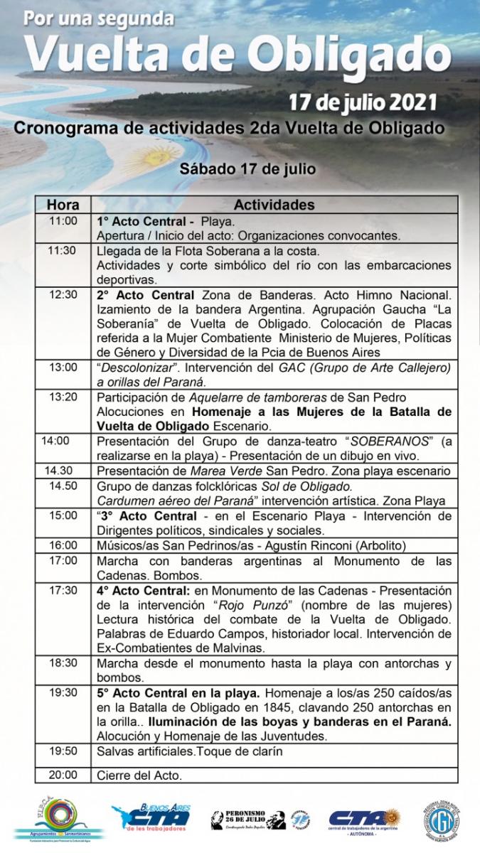 El sábado 17 de Julio a partir de las 11, el Peronismo 26 de julio FIPCA, CTA de les trabajadores –Buenos Aires-, CTA Autónoma y la CGT –Regional Zona Norte BA- y más de treinta organizaciones adherentes. realizaremos una actividad conjunta en el sitio Histórico de Vuelta de Obligado - San Pedro, Provincia de Buenos Aires.